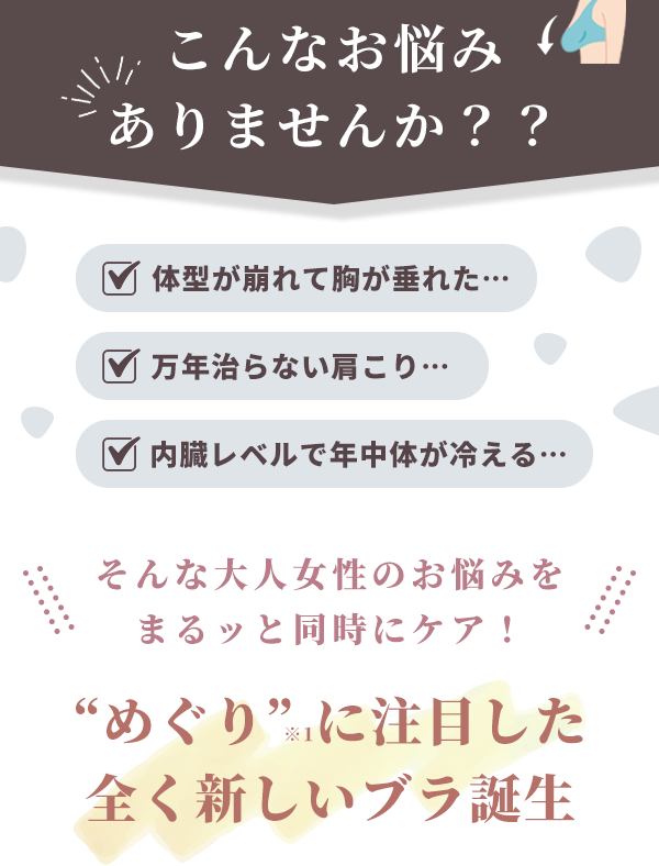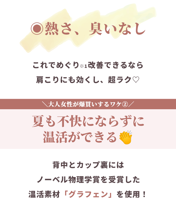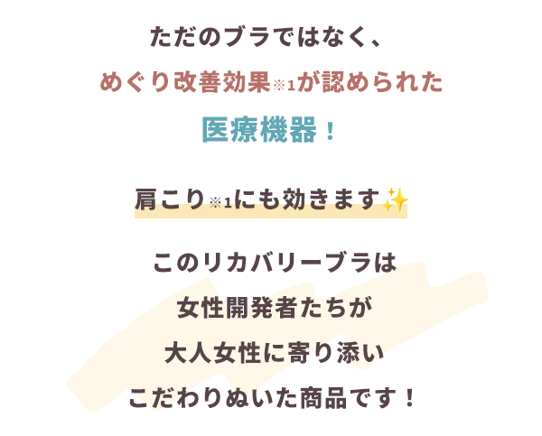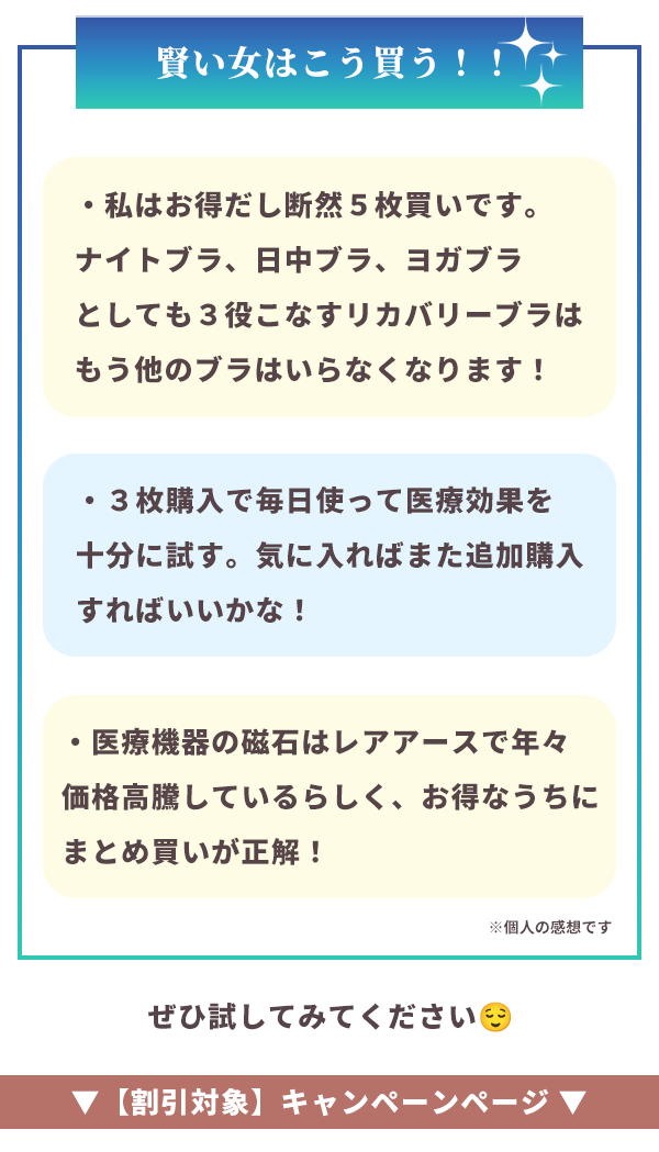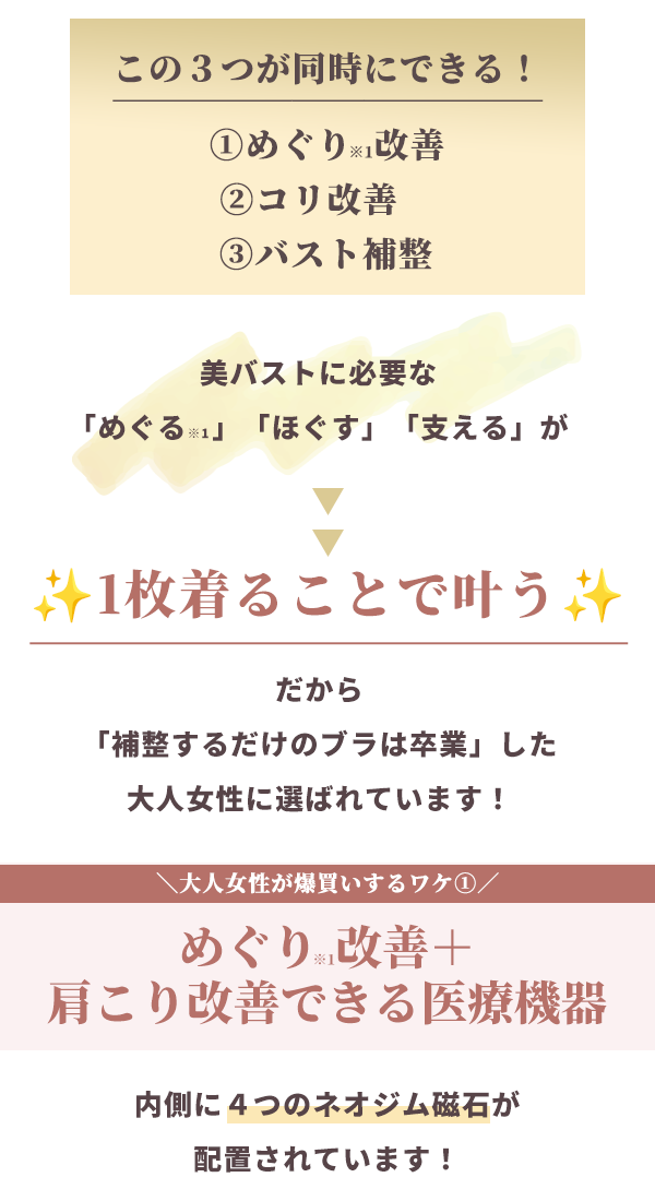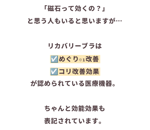 ※1:血行のこと 管理医療機器認証番号221AIBZX00029000 100ミリテスラの磁石をブラに4個配置【使用目的又は効果】永久磁石の磁力による装着部位のこり及び結構を改善する※2:筋肉のコリ改善のこと ※3:使用中の着圧による物理的効果で医療効果ではありません。